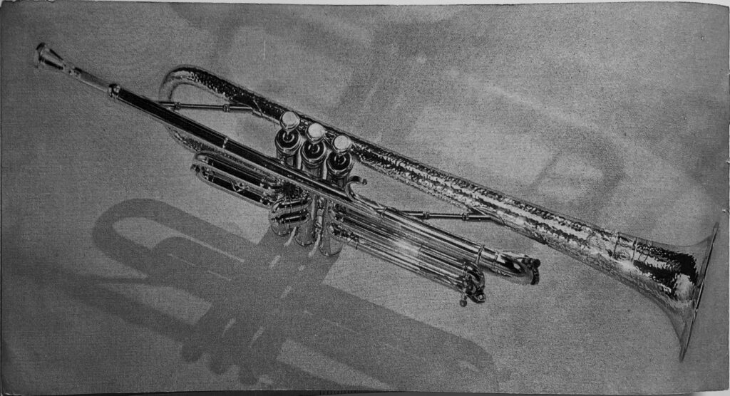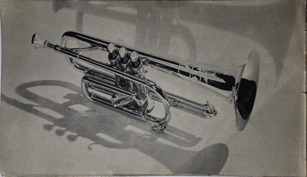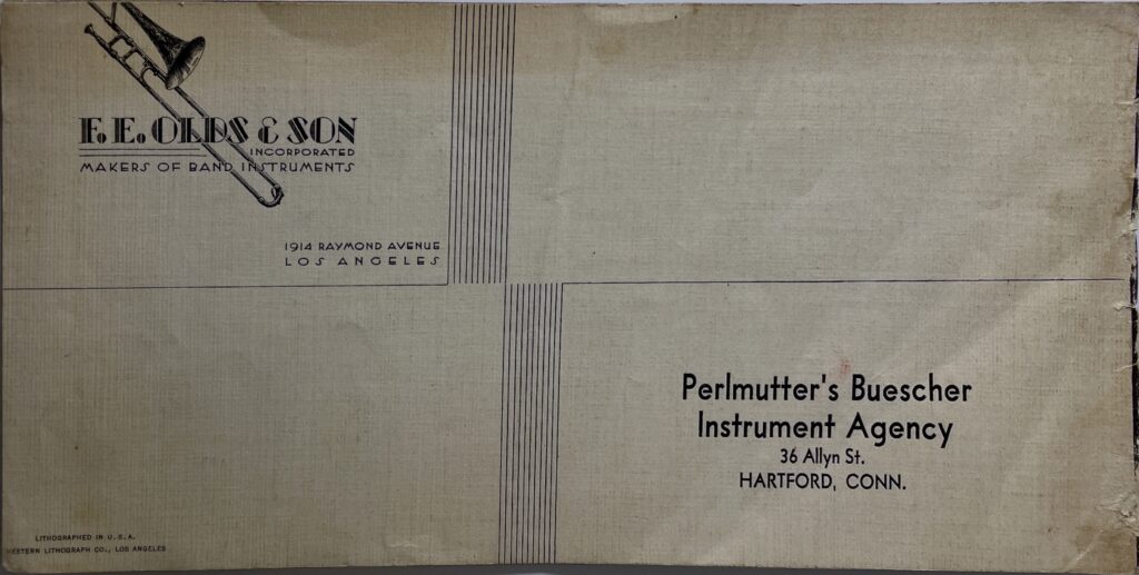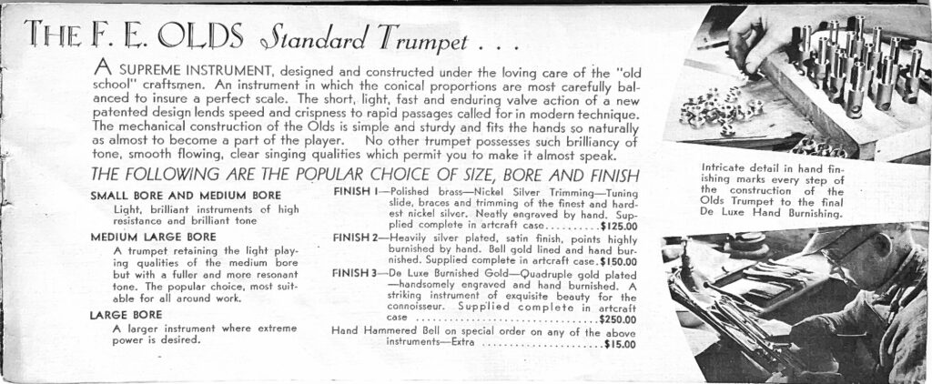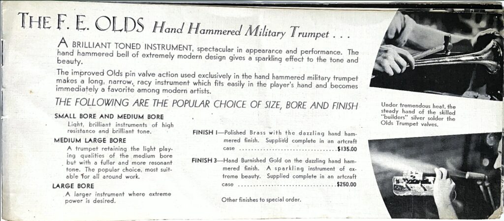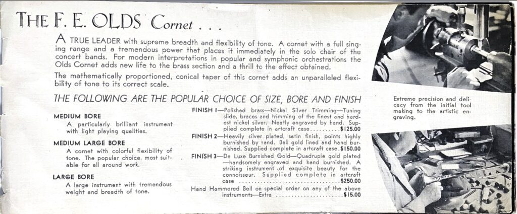 This is an undated brochure that has been generously provided by John Trayer. It is estimated to be from 1933 and features several photographs from the Will Connell collection. In one of those photographs, the valve pistons for a trumpet are shown with the serial number 565. The current serial number estimates would place serial number 565 in late 1932. This brochure is the earliest Olds marketing material to include the Standard Cornet and the Military trumpet. The oldest recorded Military Trumpet in the Olds Register is 705 and the oldest recorded cornet in the Olds Register is 746. There could obviously be older examples not yet recorded in the Register, but this evidence suggests publication around 1933