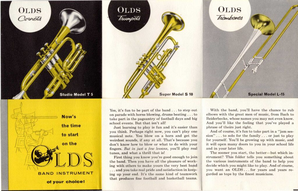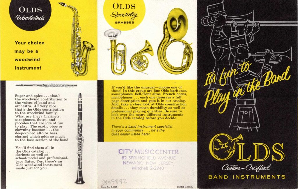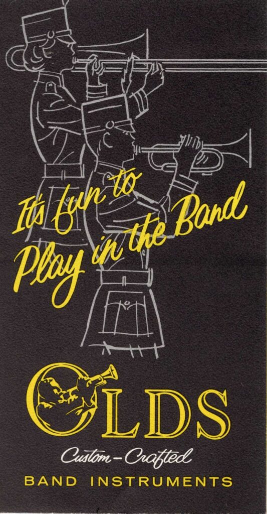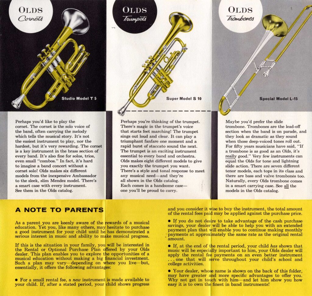 Thanks to John Thorne for providing this fold out brochure. As with many Olds catalogs and brochures, it is undated, but it uses the “Custom Crafted” tag line, which first appears in the catalog that is estimated to be from 1961. The music store that is stamped on the brochure does not have a zip code in the address, so this tells us that it is prior to 1963.