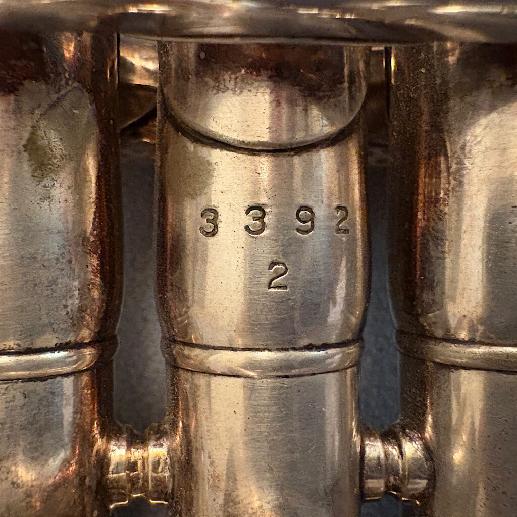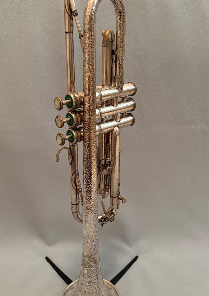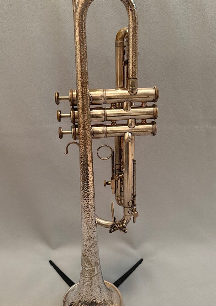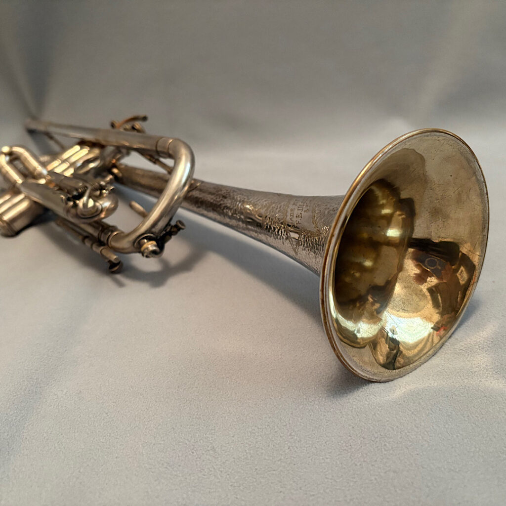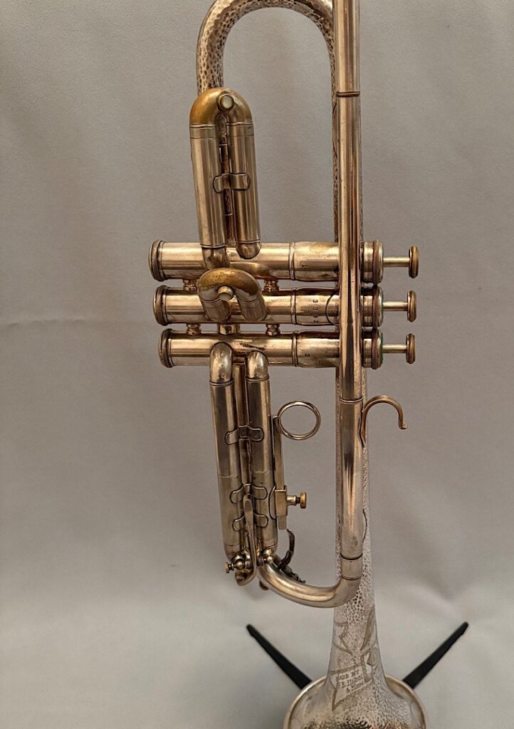 Jake DuPratt recently added several Olds Trumpets and Cornets from his collection to the Olds Register. Among them is a 1936 Olds Military trumpet in what appears to be original factory silver plating with a gold wash bell. Here are some photos of this beautiful trumpet:
