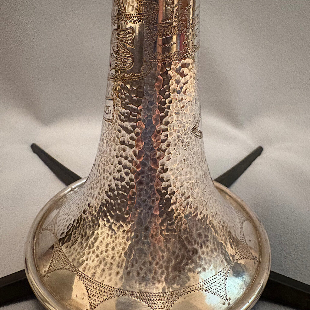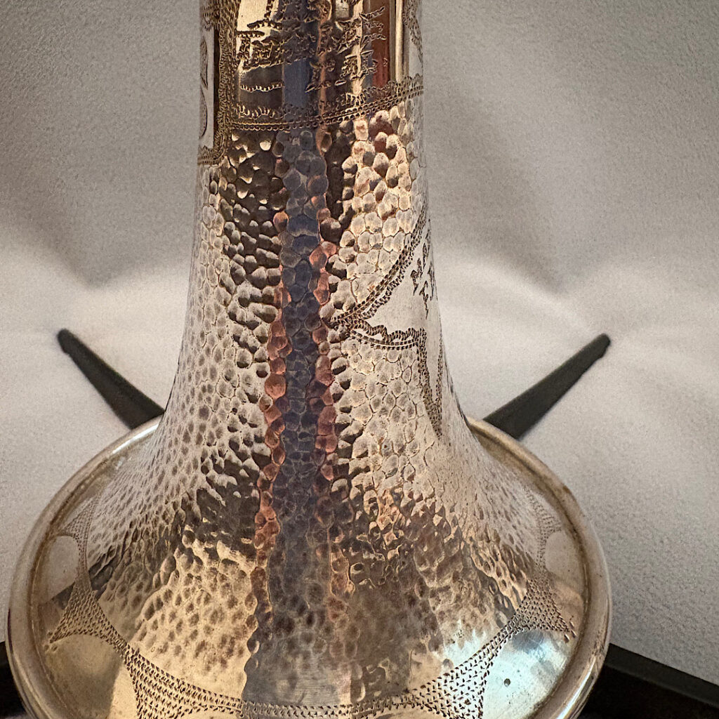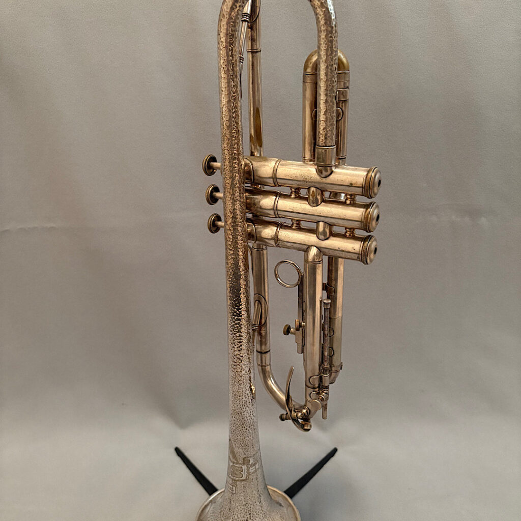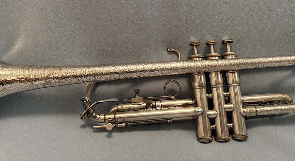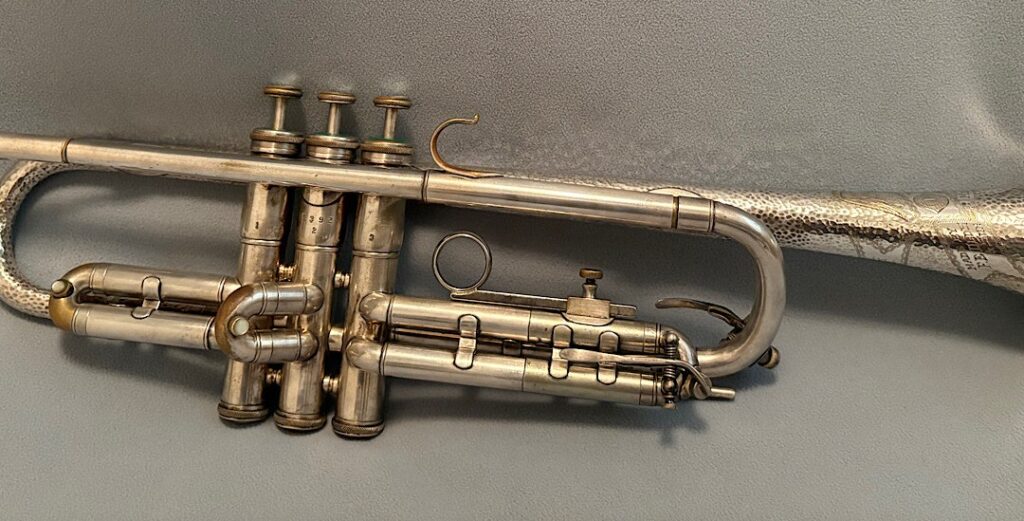 Jake DuPratt recently added several Olds Trumpets and Cornets from his collection to the Olds Register. Among them is a 1936 Olds Military trumpet in what appears to be original factory silver plating with a gold wash bell. Here are some photos of this beautiful trumpet:
