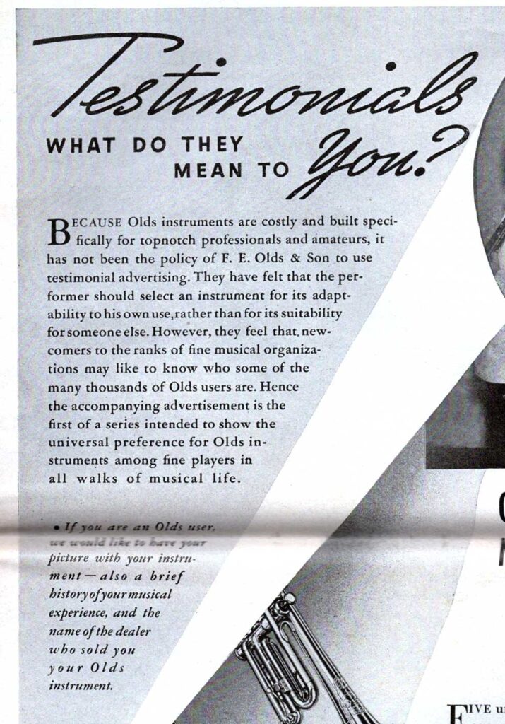 In this recently discovered advertisement in the March 15, 1940 issue of Down Beat, Olds had this to say regarding “testimonials”