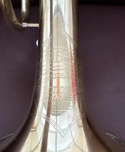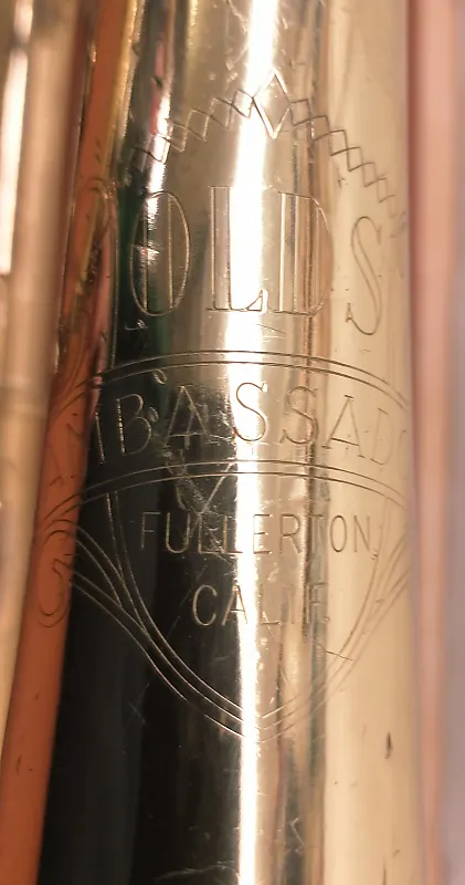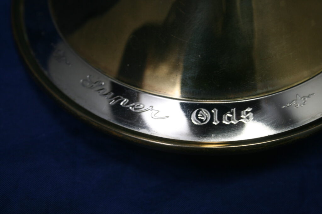 The Recording model has several features that are unique from other Olds models such as the offset middle valve and the Re-O-loy (red brass) bell, but for much of the Fullerton production, it has distinctive bell engraving.