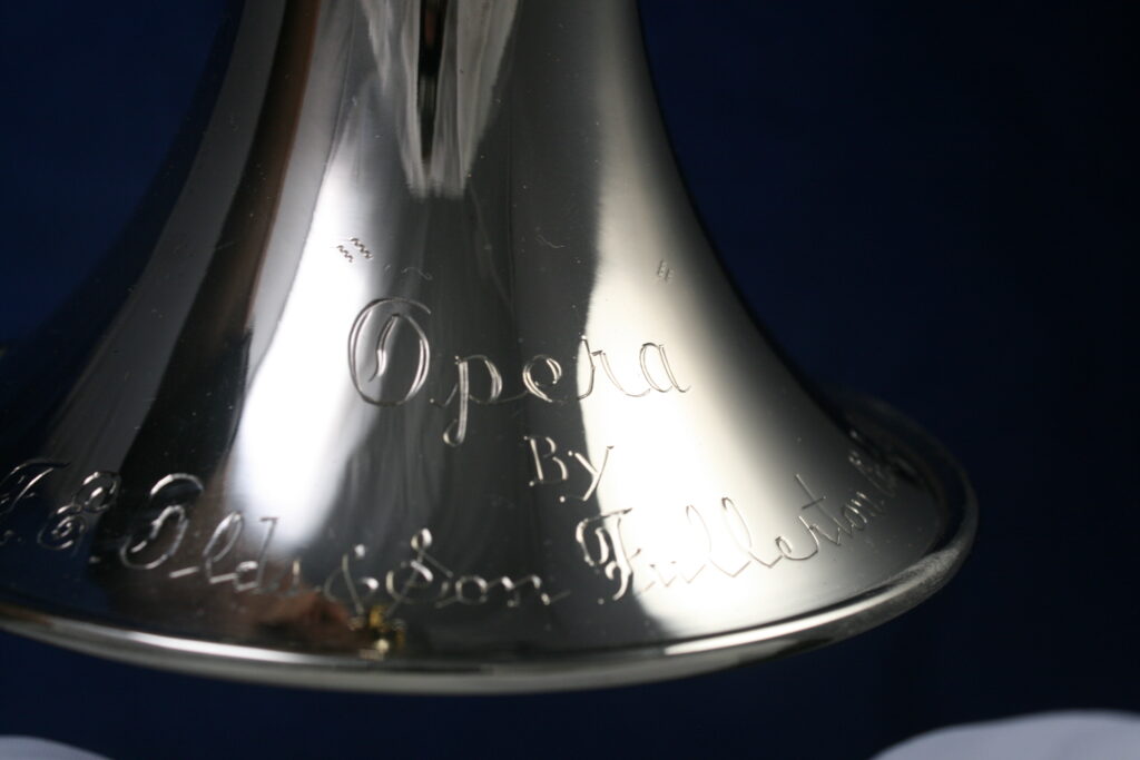 The Opera models were only made for a few years in Fullerton. Although there is a version with a brass bell, most Opera models were brass with a lot of nickel-silver trim and nickel-silver bells. It had a first valve slide trigger, but a standard push rod on the third valve slide.