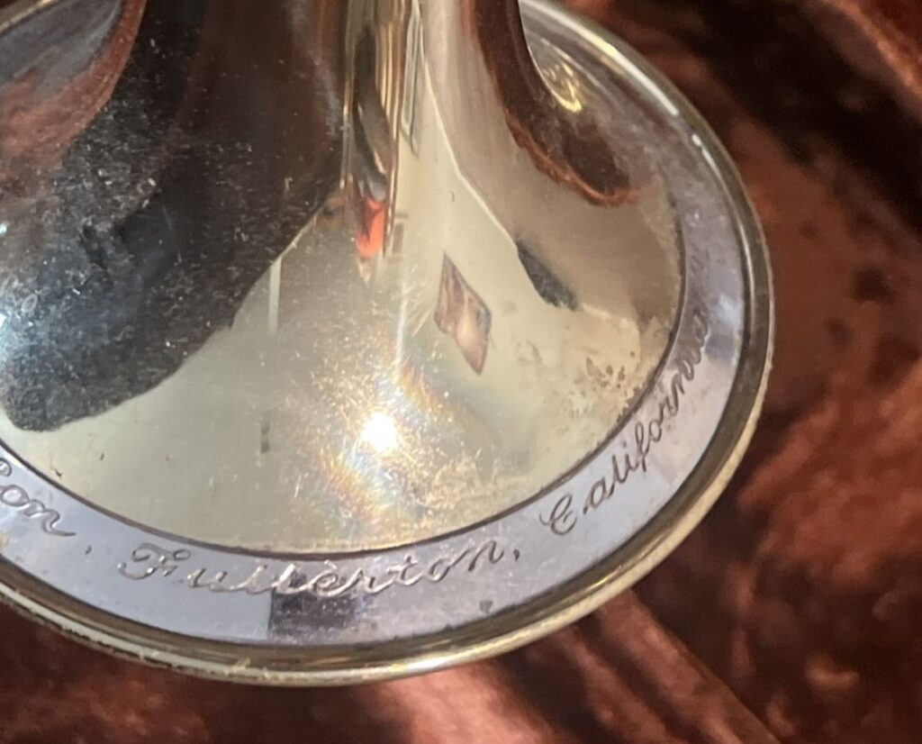 Both the Super model trumpet and cornet are the only models produced in the Fullerton era with a Nickel-Silver “tone control band” sometimes referred to as bell garland. For the first five years or so of Fullerton production, this band continued to have “Los Angeles” engraved on it. Speculation is that Olds had a supply of these engraved rings prior to the move and simply used the supply on hand until they were exhausted in approximately 1960. If your Olds Super trumpet or cornet has a serial number higher than 145000, it was likely made in Fullerton.